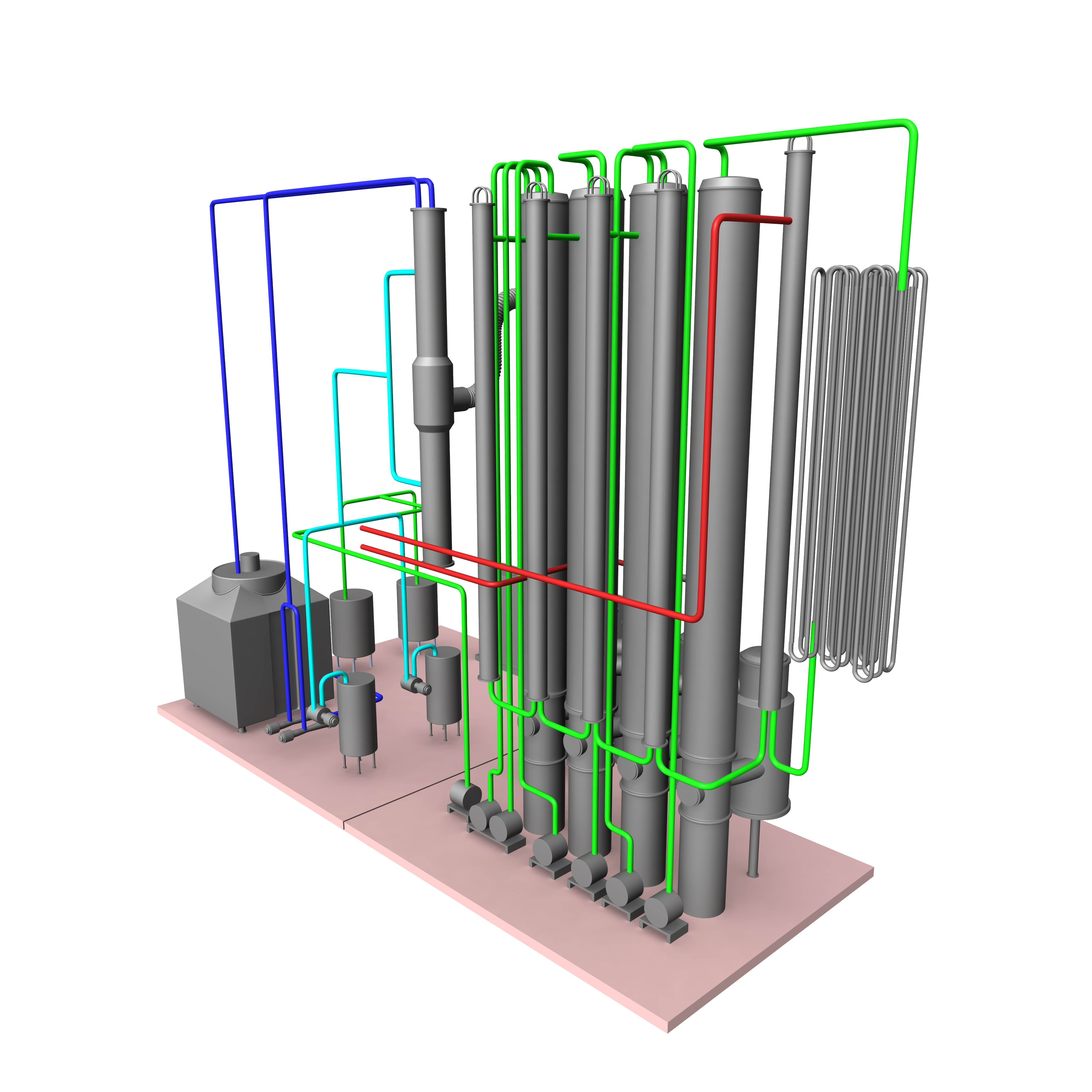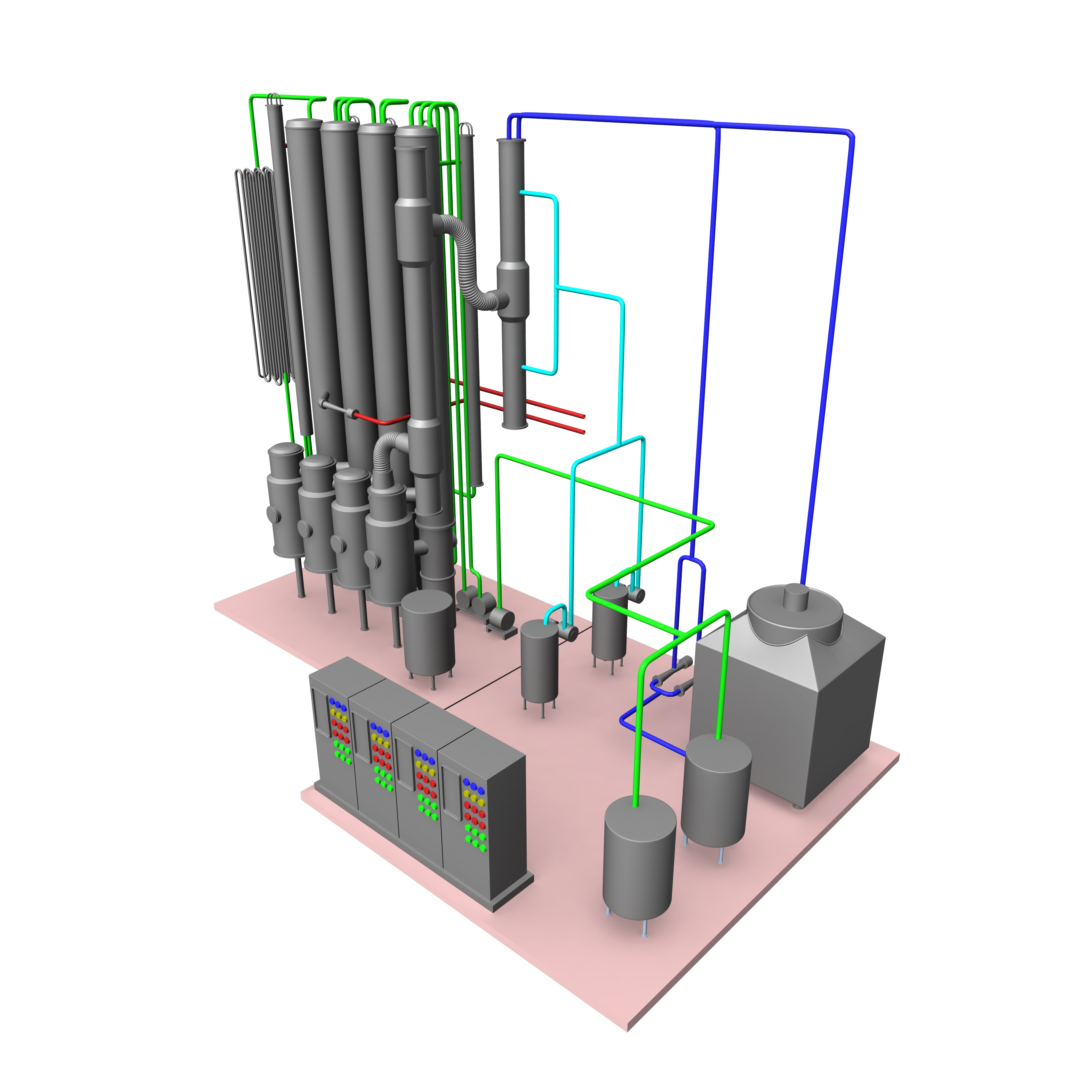The Multiple Effect Evaportors are designed to economize the consumption of energy. The multiple-effect configuration combines two or more evaporator bodies to conserve steam, wichc is condensed in the frst-effect heat exchanger only. Water evaporated in the first-effect vapor body is condensed in the second-effect heat exchanger, wich provides energy for evaporation in the second-effect vapor body (and so on for additional effects). Vapor from the last effect flows to a condenser.